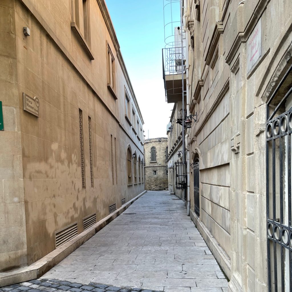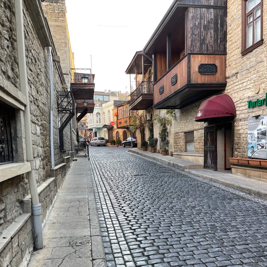 I found an entrance that was open and wandered into Baku’s Old Town district. This area was built hundreds and thousands of years ago when Baku was first colonized, as a key stop along the Silk Road. This district is the area that remains today. It has an entirely different vibe from the otherwise-ultra-modern city and is filled with narrow and winding passageways. Cars trundle up and down brick roads, making seemingly impossible turns in tight quarters. Delivery men ferry food on bicycles to tourists staying in buildings that have been converted to chic boutique hotels. Restaurants and bars beckon from some roads, while others are eerily deserted.