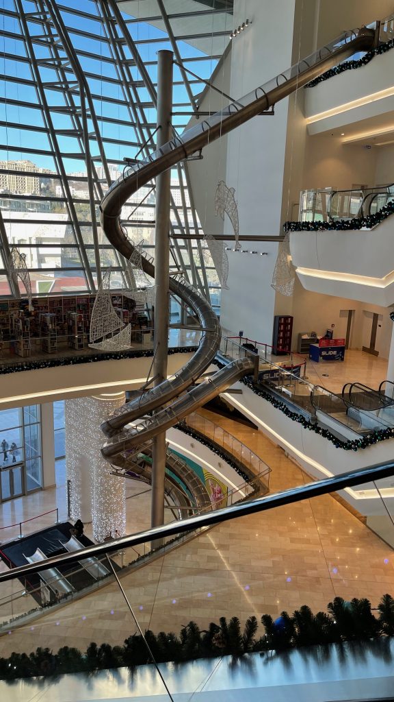 As I continued my walk, I came upon more stunning buildings. One of Azerbaijan’s most significant exports is carpets (i.e. rugs) and they have a museum dedicated to the industry; naturally, it’s shaped like a rolled up rug. Another, even grander, mall is shaped like a giant star and has a massive slide inside. And the “Flame Towers” are shaped like flames and have dancing flames projected on them at night.